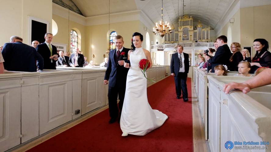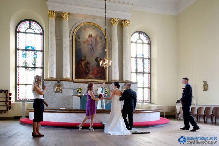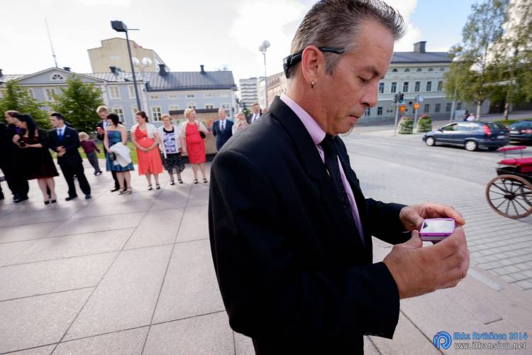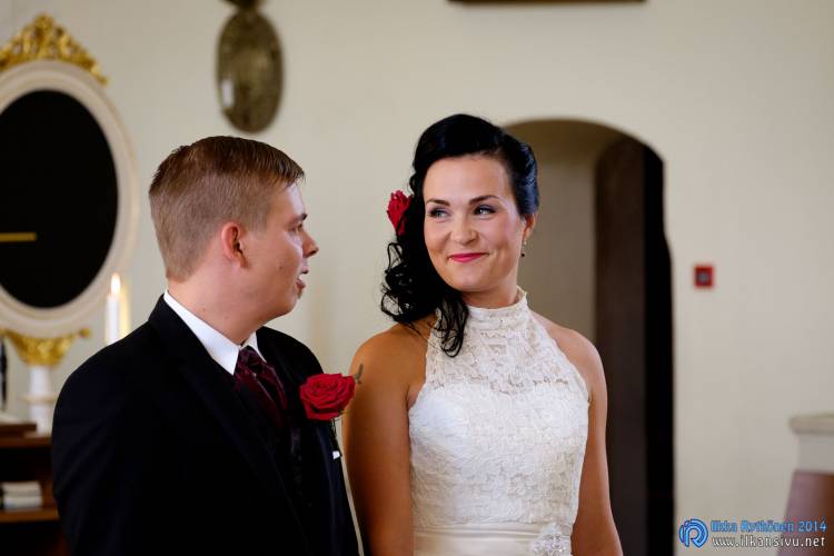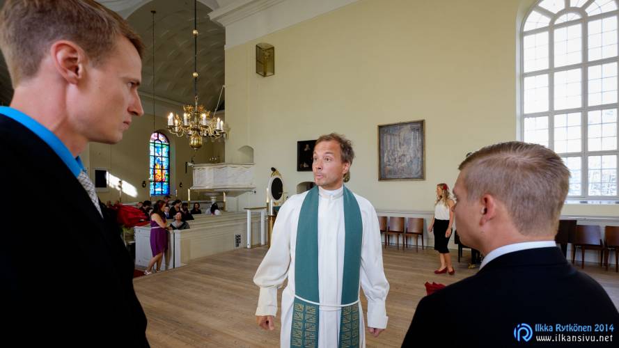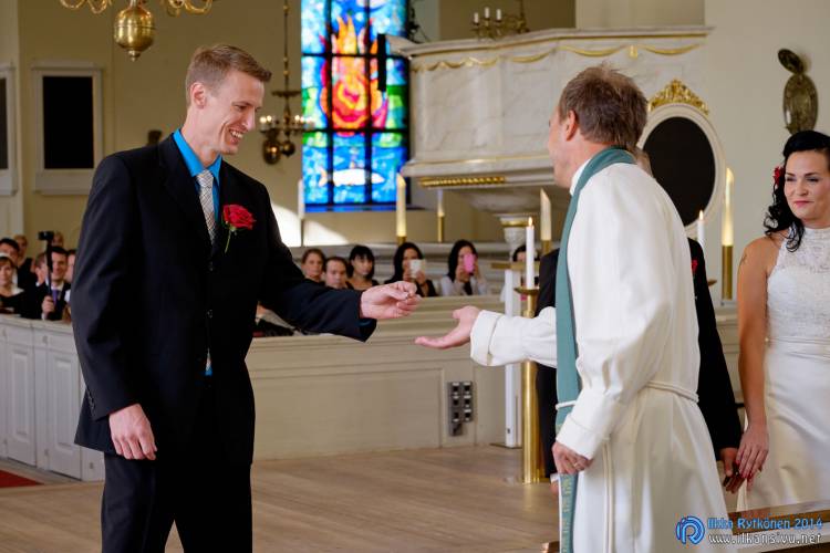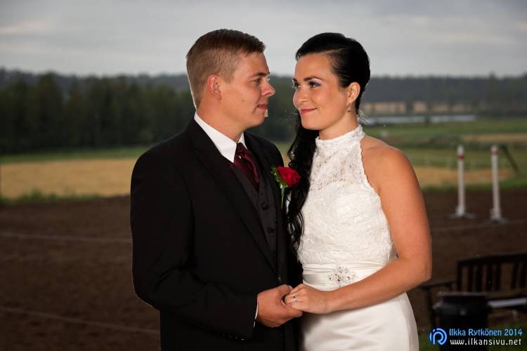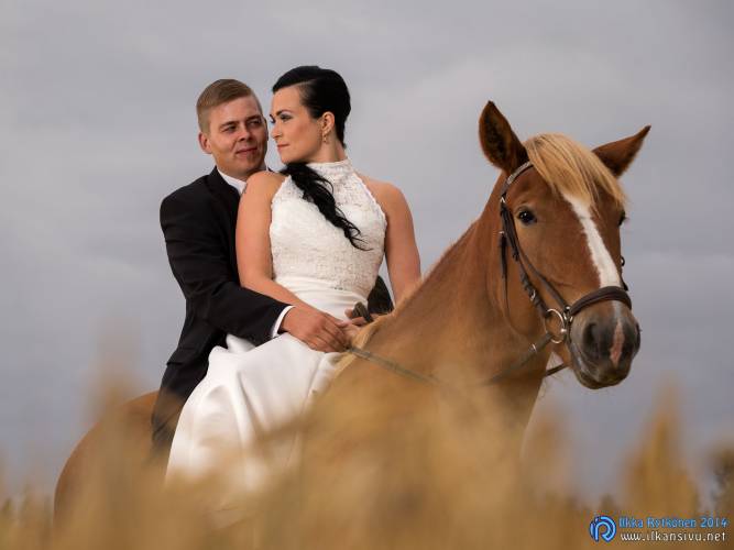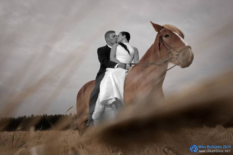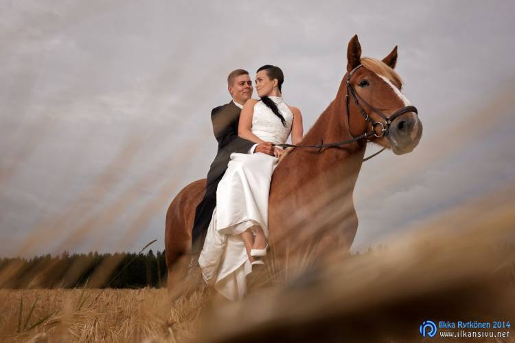 We had portrait photo session earlier in the week before the wedding ceremony. It started to rain just before shooting so we started photographing in a barn. Rain wasn’t any more so hard so we went to a wet barley field. Flashes needed to protect from the rain but camera and lenses were weather sealed so I could shoot pretty free. Horse was part of the photography.