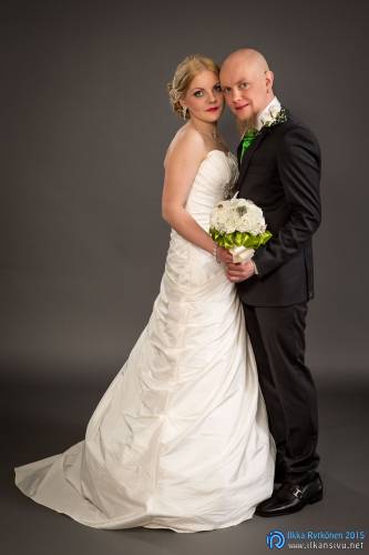 Minnan ja Mikon vihkipäivää vietettiin 23.5.2015. Olimme aiemmin viikolla käyneet katsomassa ennakkoon muutaman hyvä paikan miljöömuotokuville. Hääpäivänä oli kuitenkin melkoinen vesisade, eikä lämpötilakaan ollut kovin korkealla. Varasuunnitelman mukaisesti viritimme taustakartongin parin olohuoneeseen, jossa otimme sitten studiomaiset häämuotokuvat.